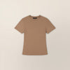Woman wearing a Marame Fitted T-Shirt in Cinnamon Sugar, front view.