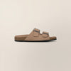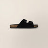 Suede sandals with wide straps and a clean, open-toe design. The contoured footbed offers comfort for all-day wear, while oversized buckles add a considered finish. Crafted for ease and versatility, they bring a refined, relaxed feel to warm-weather looks.